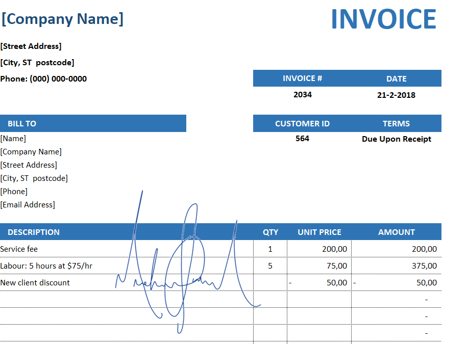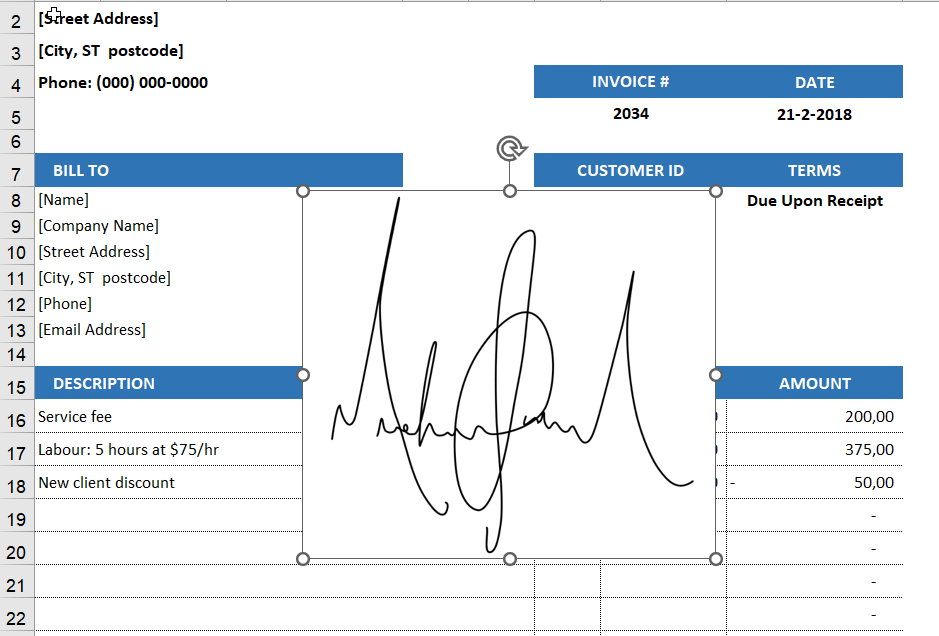 Je wilt je handtekening op een Excel werkblad zetten waarop bijvoorbeeld een factuur staat. Dit is je handtekening.