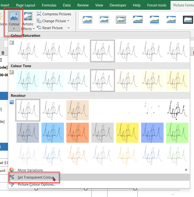 Vervolgens kies je in de menubalk voor Picture Format en dan: Colour | Set transparent colour (Staat onderaan): En klik in het witte gedeelte (de achtergrond). Je kunt je handtekening ook nog van een andere kleur voorzien.