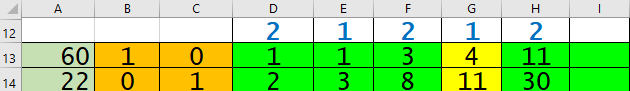 Dan gaan we vermenigvuldigen. Je ziet dat er maar 1 combinatie is met drie enen (1*1*1) = 1 (rode gedeelte) en die correspondeert met de 5e waarde namelijk 324512774 en dat is tegelijk het eindresultaat omdat we geen verdere waarden hoeven op te tellen.