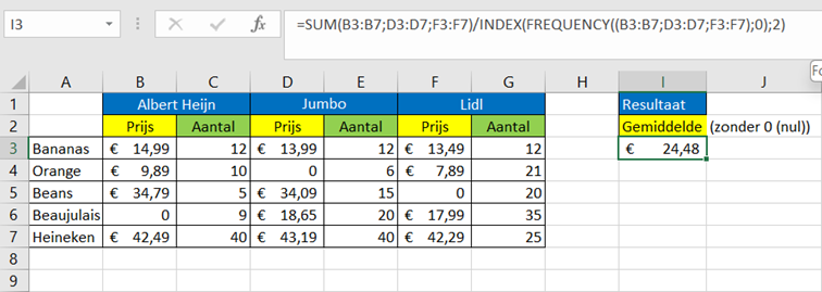 De producten hebben 2 categorieën namelijk Prijs en Aantal.  We gaan het prijs-gemiddelde uit de tabel halen. We weten dat het gemiddelde geen rekening houdt met 0-waarden in de cellen. Het juiste antwoord zou €24,48 moeten zijn waarbij de nullen genegeerd worden.