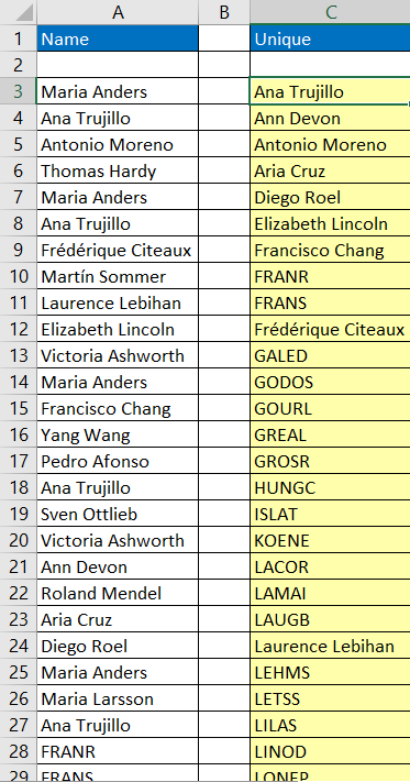 In $A$3:$A$93 namen waaronder veel dubbele namen, We willen in C3 een lijst met unieke namen en die lijst sorteren van A naar Z. Niet al te moeilijk. We hebben slechts één formule nodig.