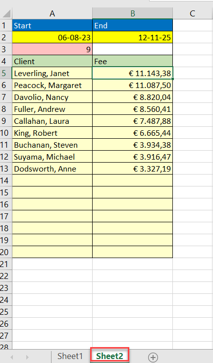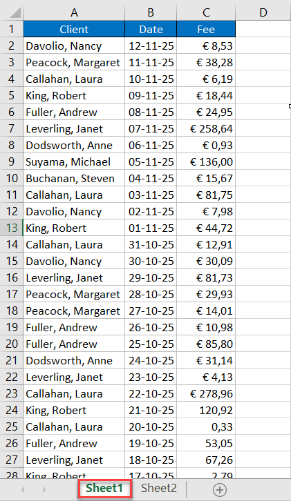 Op Sheet1 staan Client in Kolom A. In Kolom B Date en in Kolom C staan Fee. In Kolom A kan de naam van dezelfde Client meerdere keren voorkomen.
