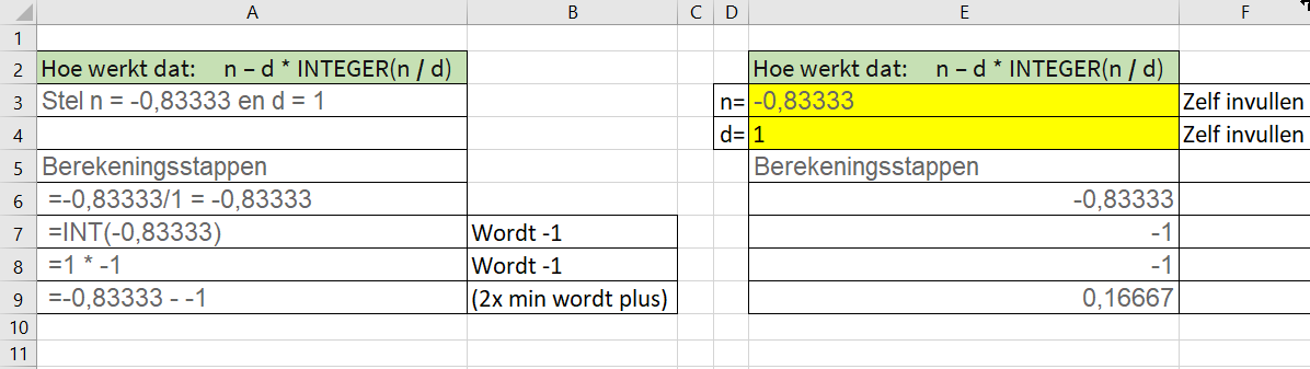 Hoe werkt dat:     n – d * INTEGER(n / d)