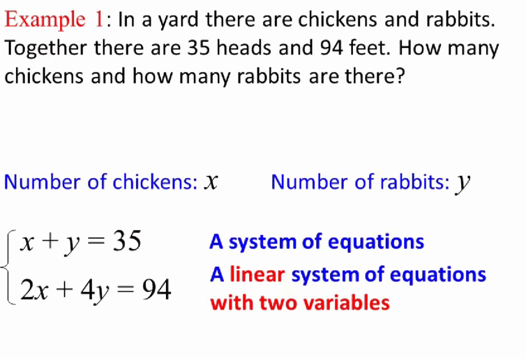 Een boer heeft in totaal 35 konijnen en kippen in zijn stal. En die konijnen en kippen hebben samen 94 poten. Hoeveel kippen en hoeveel konijnen zijn er?