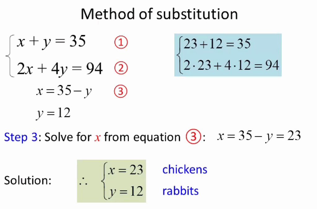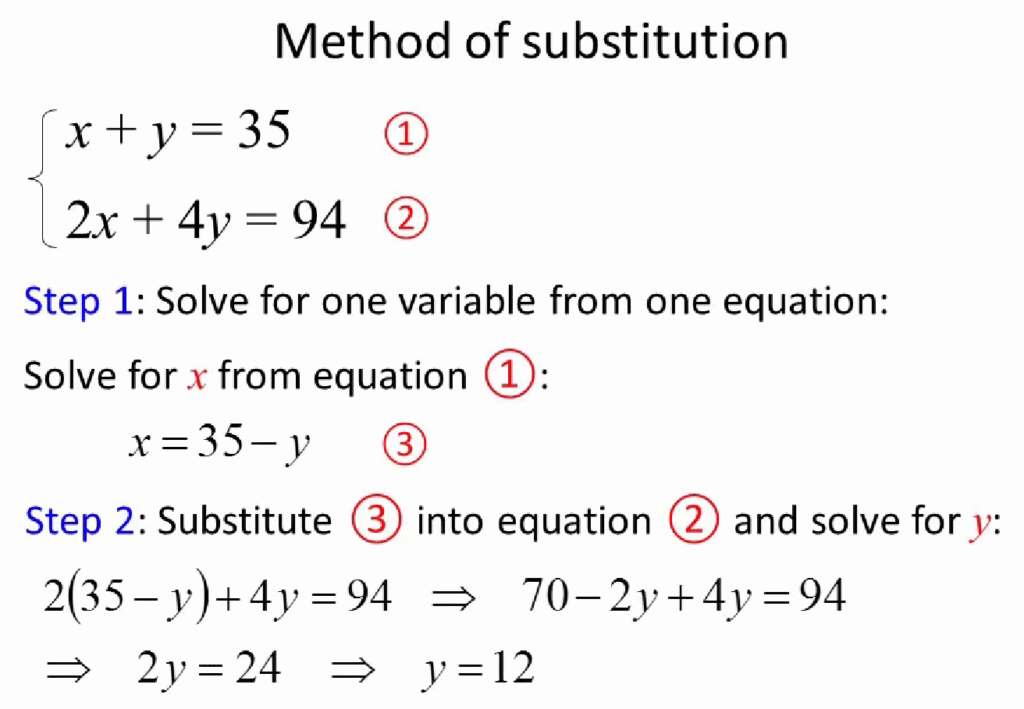 Tenslotte: x = 35 – y eindresultaat: x = 35 – 12 = 23