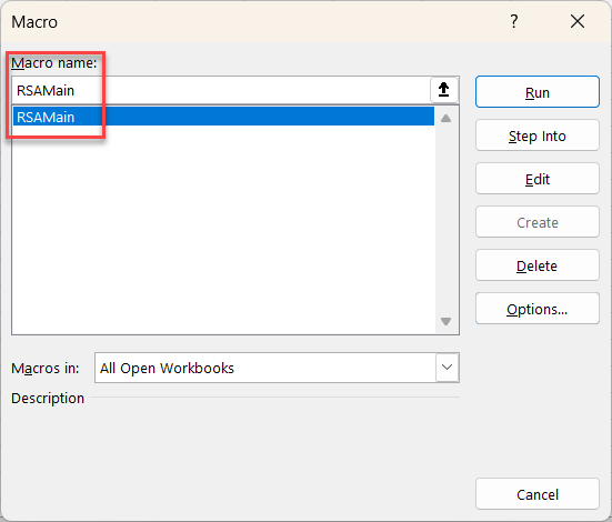 Druk op de toetscombinatie ALT + F8 om de Macro Dialoog te tonen. Dubbelklik op de macro naam, RSAMain om te starten. Of kies voor View | Macro | View Macro. Dan zie je de macro naam staan: RSAMain. Klik op Run. De code voegt een nieuw werkblad in met de naam RSA met daarop een samenvatting van wat gebeurd is.